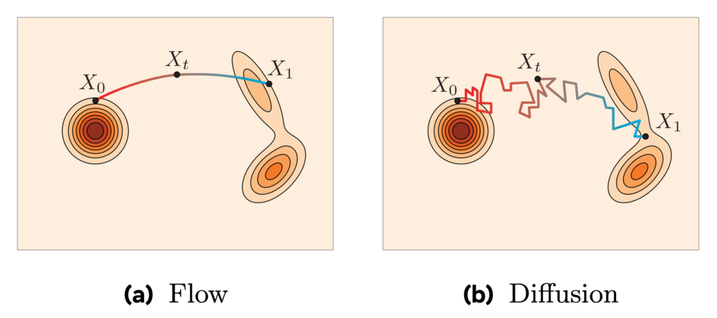 Imagine a solid object made of sand (the data distribution). Now imagine you put a tiny explosive at the middle of it and detonate it (noising): it will become a cloud of sand grains (the Gaussian noise distribution). When accounting for air turbulence, the direction in which each grain of sand was blown away is noisy and unpredictable. On the other hand, if you ignore the turbulence of the air, every grain of sand has a distinct direction in which it was blown away. That is the main difference between diffusion models and flow matching models: the former model noisy and stochastic paths, the latter model clear paths.